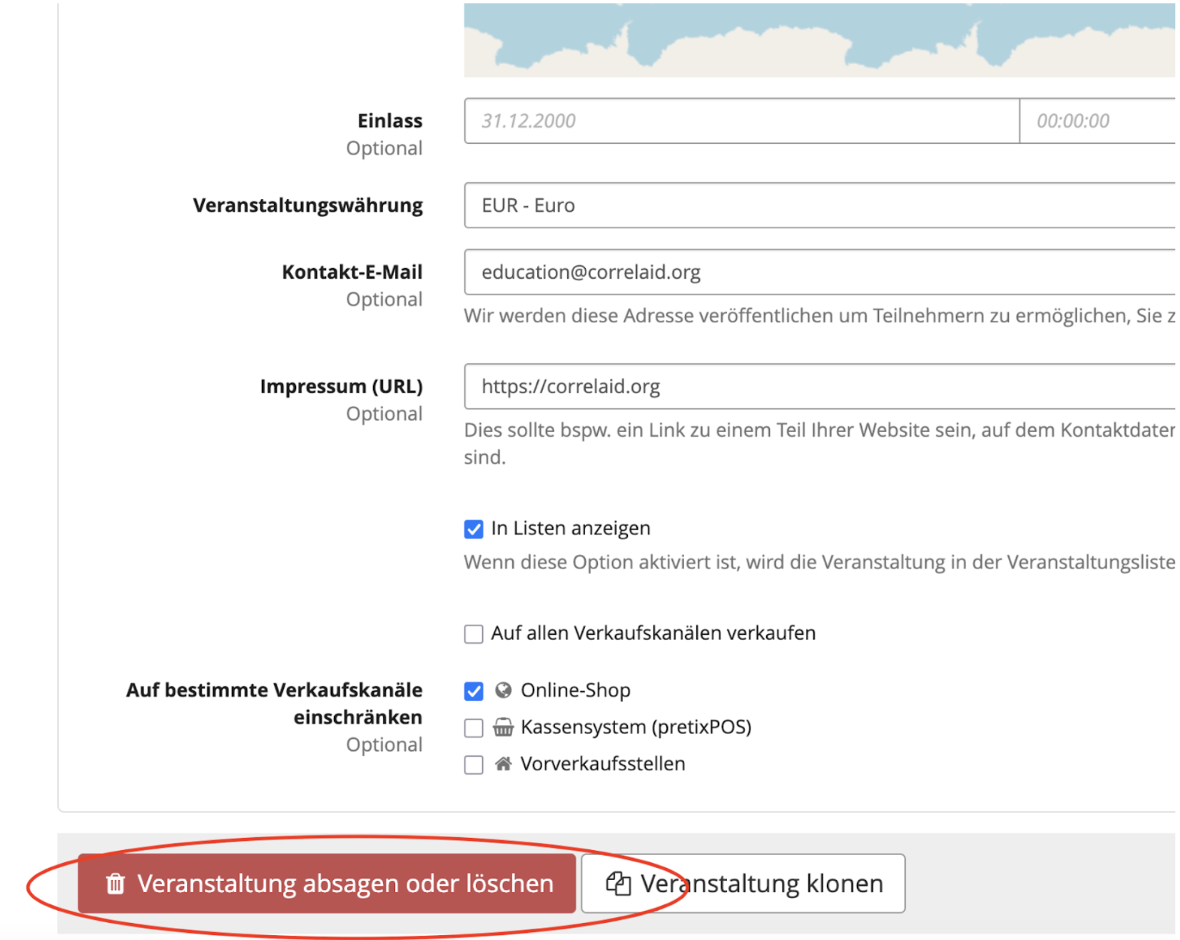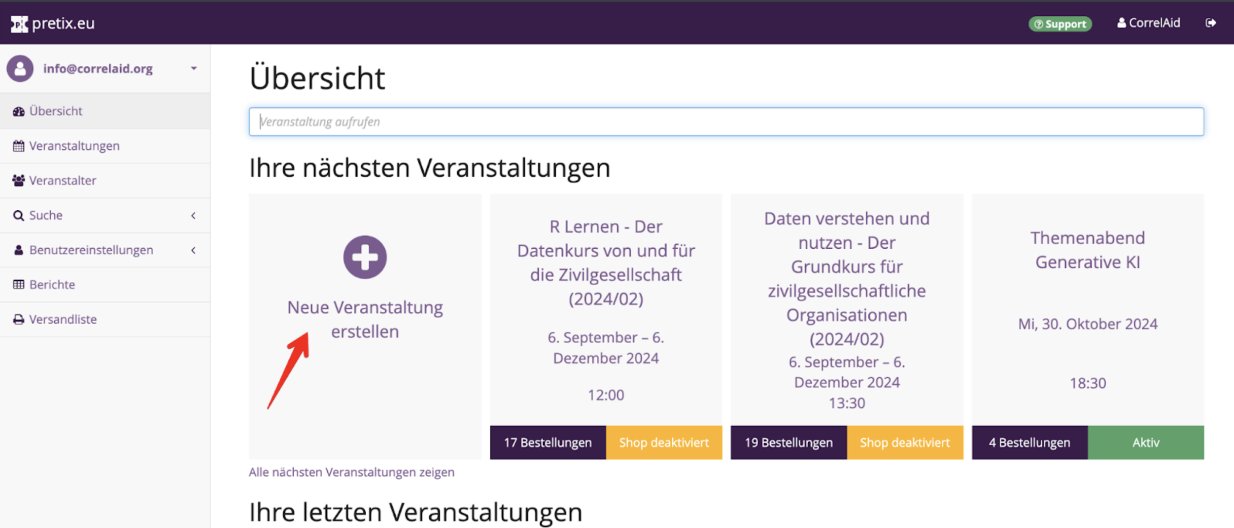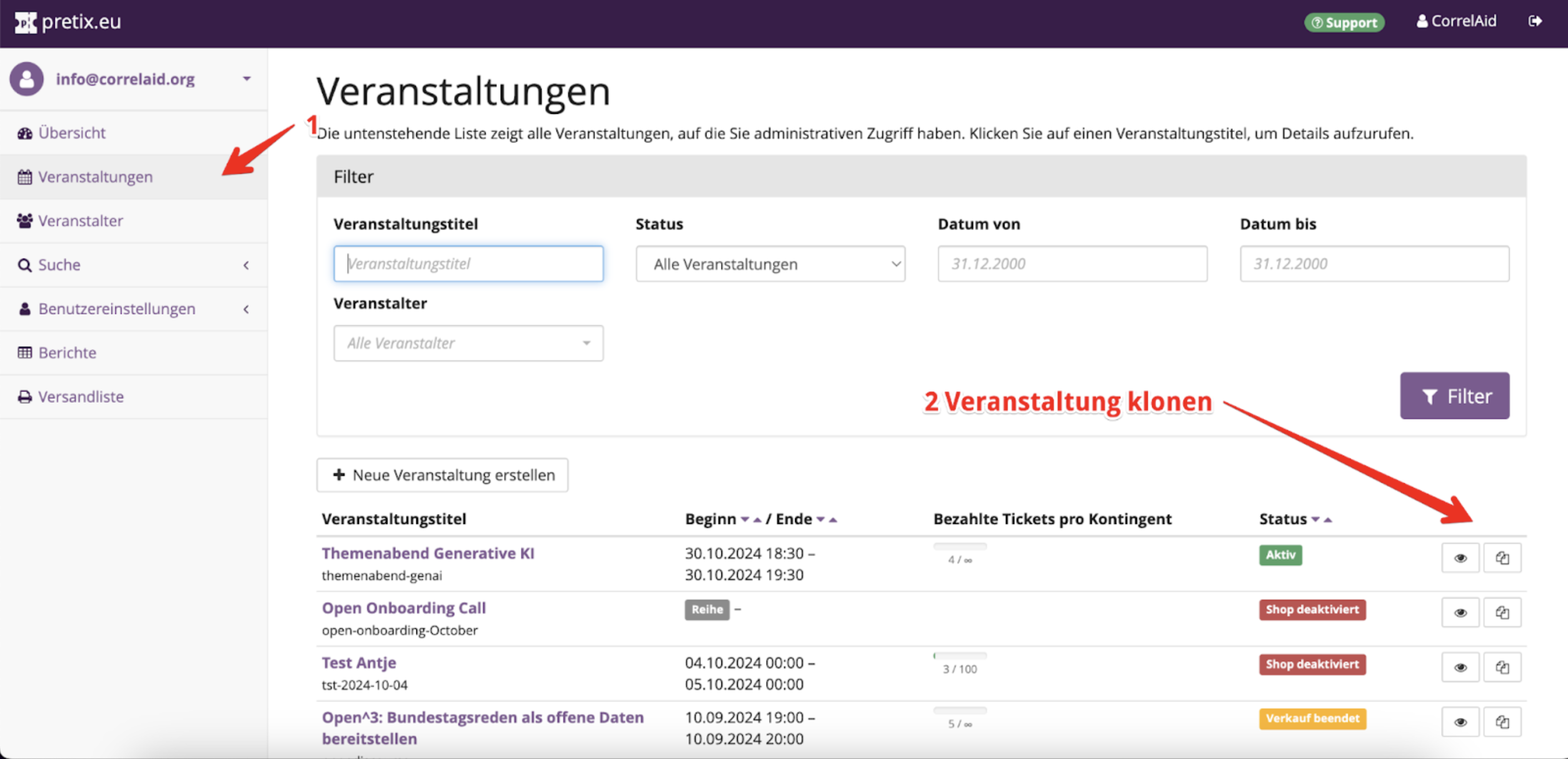 To create an event in Pretix, you can either create one from scratch or duplicate an existing one: