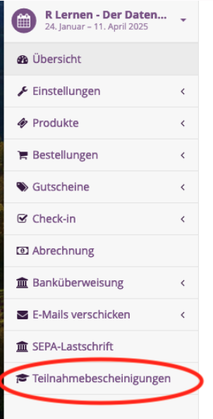 Certificates of attendance can be created for each course. The item can be found at the bottom left of the menu. If no button is visible there yet, you will need to activate the participation certificates under Settings -> Extensions.