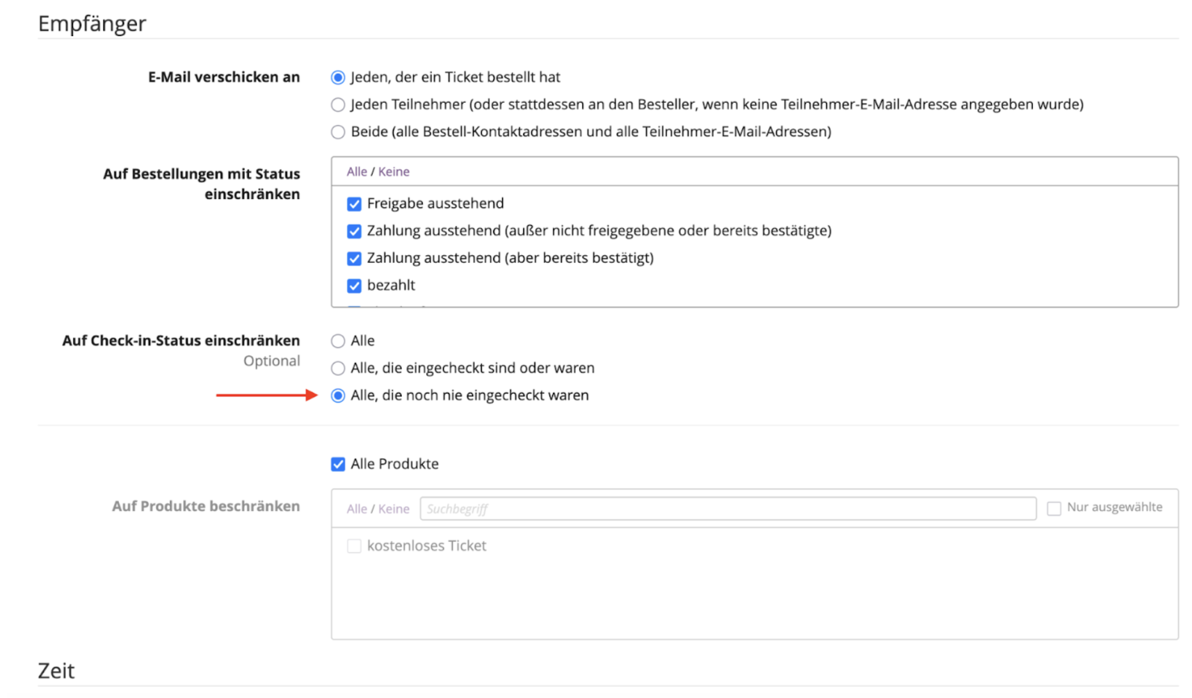 It is important to link the mailing to the check-in status (“unchecked-in participants”) and then to keep the check-in list in Pretix at the event itself: